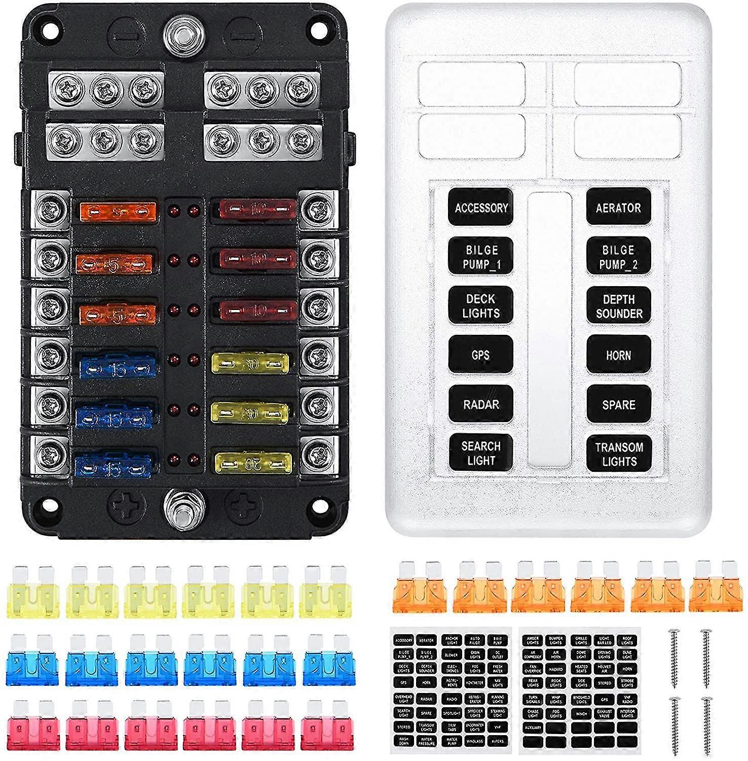 12 Way Teardrop Fuse Holder, Fuse Box With 24 Fuses 12 Led Lights Protective Cover For Car Boat Motorhome