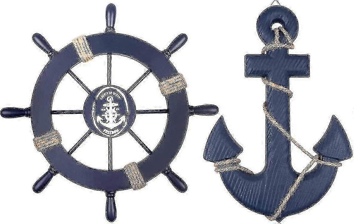 2 Pack 28cm Wooden Boat Wheel And 33cm Wooden Anchor With Rope Boat Nautical Steering Rudder Wall Decor Door Hanging Ornament