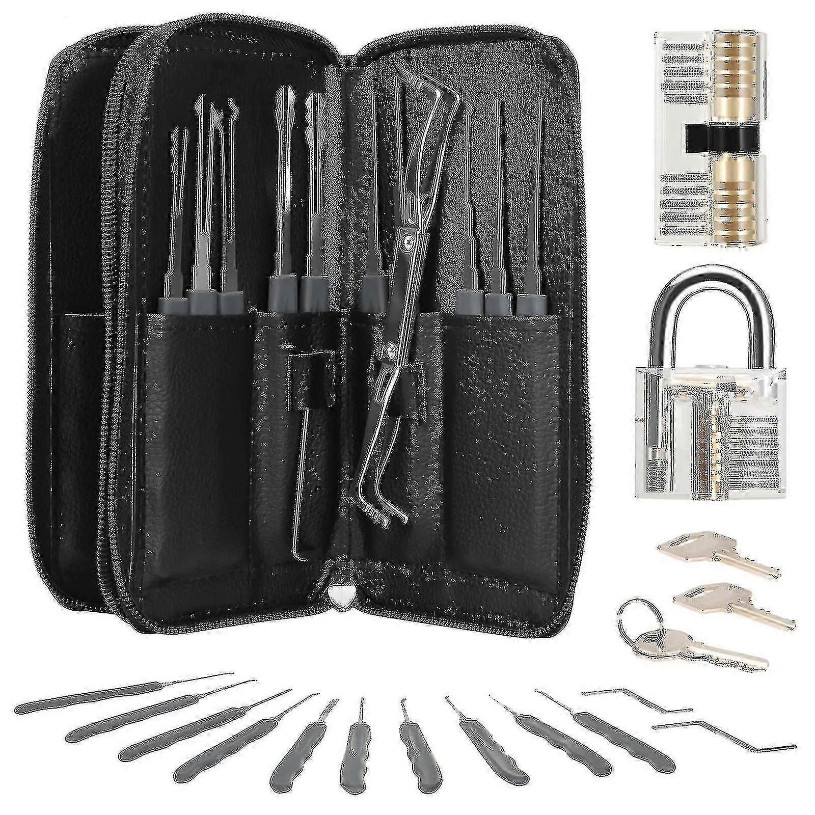 Features:1. Exquisite design: Stainless steel tool kit, with Transparent Lock and keys, and with a black synthetic leather bag for storage.2. Improved functions: exercise the brain and bring more fun, different tools can solve various situations.3. Practical gift: great gifts for family and friends.4. Stainless steel, durable and no rust. The ergonomic handle design is very convenient.5. Use high-quality materials to achieve smooth working conditionsNotice:1. Actual color may be slightly different from the image due to different monitor and light effect. Please allow 1-3cm deviation due to manual measurement.Specification:Material: Stainless steel Includes: 24 x lock tools, 1 x leather bag, 2 x locks, 1 set x keysincludes:24 x lock tools1 x leather bag2 x locks1 set x keys