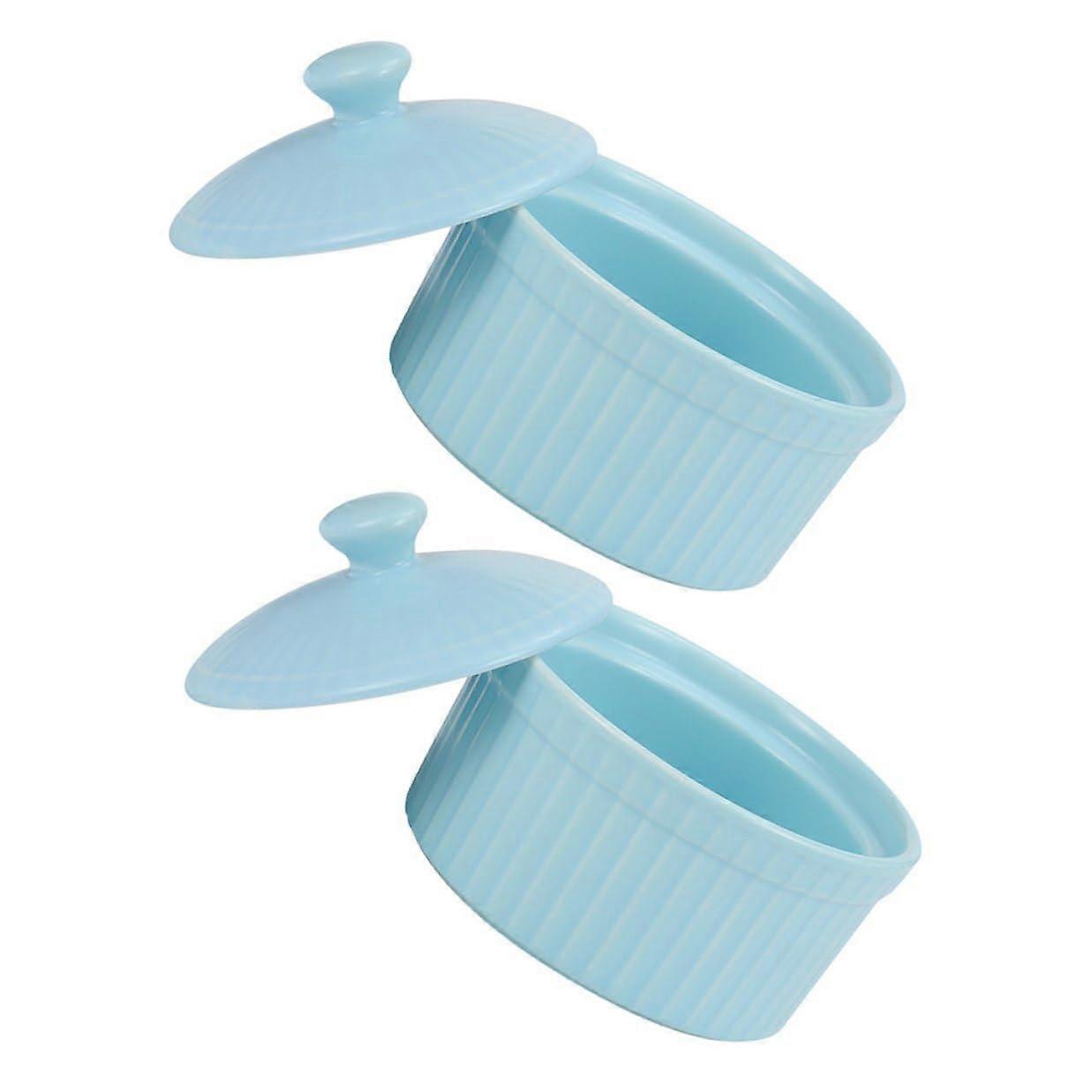 2pcs Ceramic Ramekins with Lids Oven Safe Small Baking Bowls for Desserts Snacks Blue