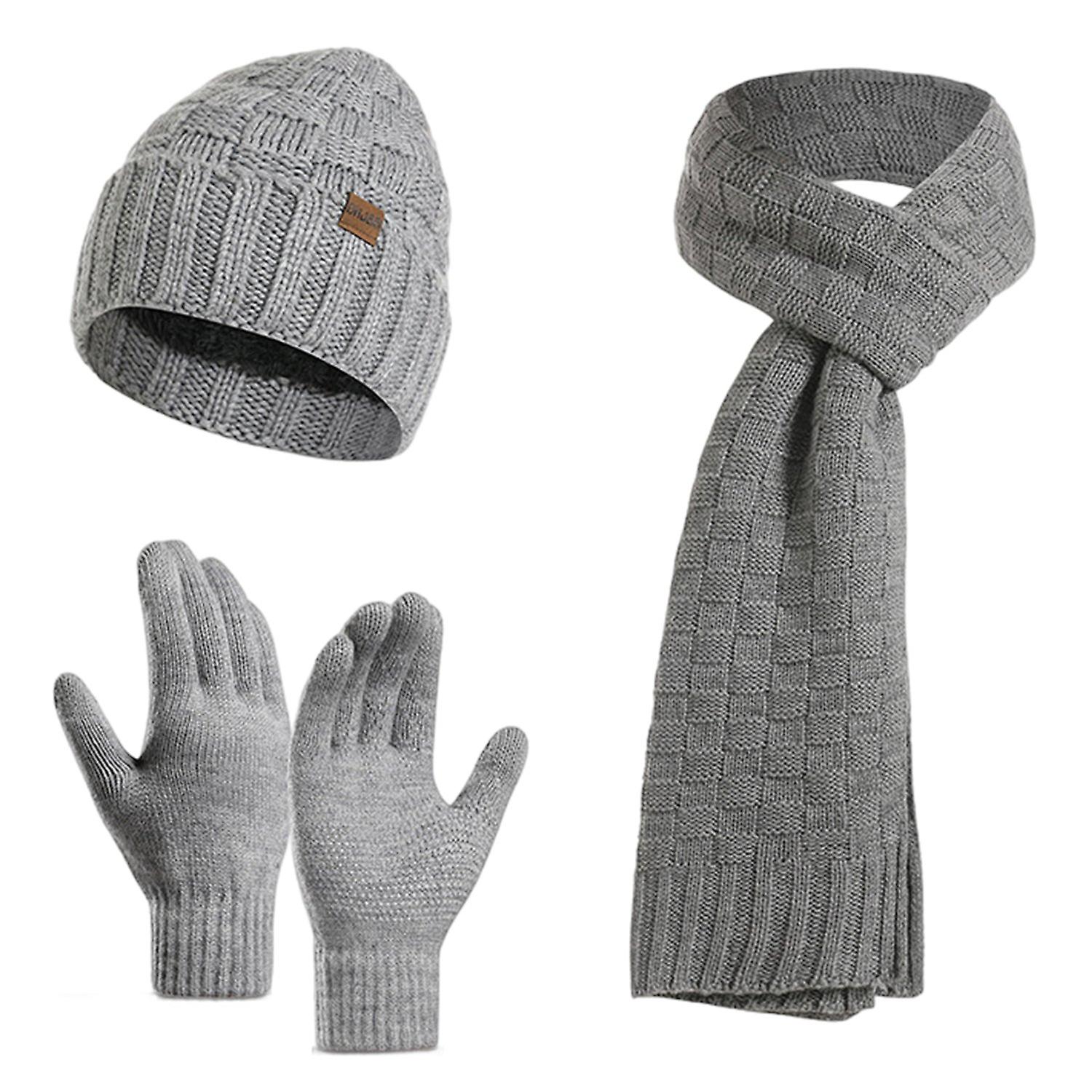 3Pcs/Set Men Scarf Hat Gloves Checkered Thickened Windproof Thermal Pure Color Keep Warm Super Soft