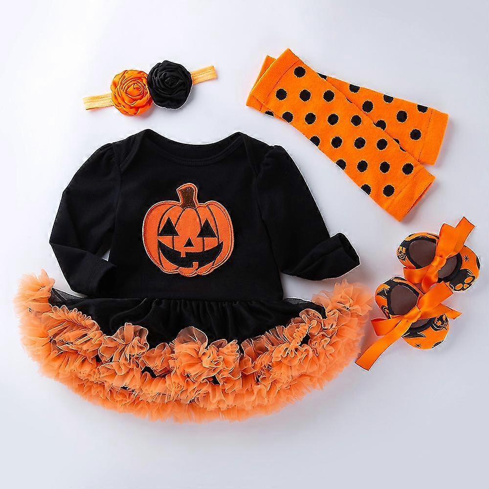 4 Piece Set Baby Long Sleeve Dress Girl Baby Halloween Pumpkin High Quality Cotton Romper Dress Toddler Shoes Set