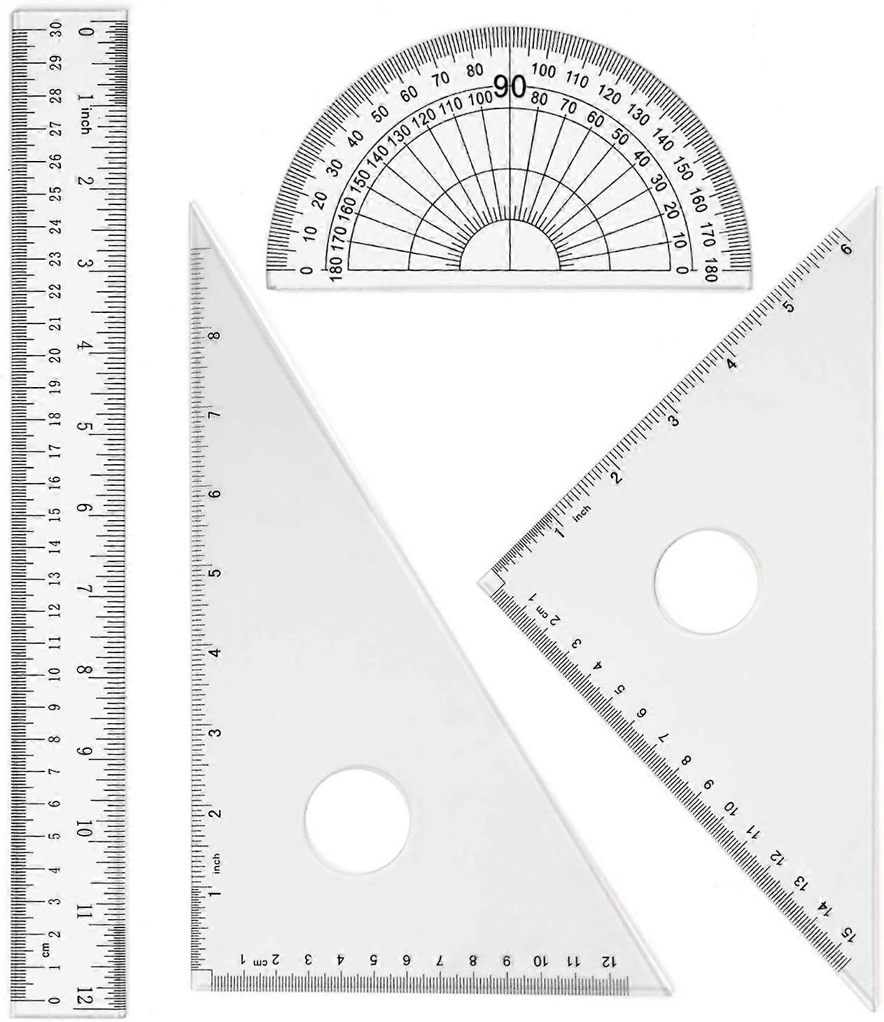 4 Pieces Math Geometry Tool Set Includes Plastic Clear Ruler, Protractor, Triangle for School Office