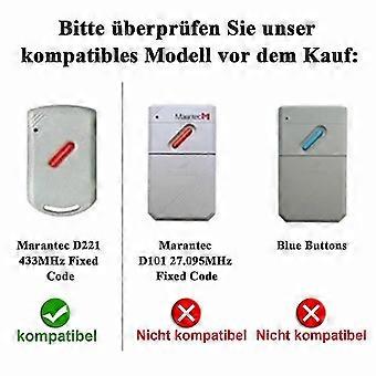 Compatibility Guaranteed: This remote is compatible with Marantec Digital models 382, 384, 302, 304, 313, 321, 323, 131, 211, 212, 214, 221, 222, 224, 231, 232, operating at 433MHz. Confirm your model and frequency match for proper functionality. Exclusivity: This remote is not compatible with Marantec Digital 868MHz models or remotes from other brands. Verify your current remote's model number and frequency before purchase. Effortless Cloning: Equipped with face-to-face (or back-to-back) cloning technology, allowing quick and simple duplication of settings from your existing remote. The 2-button design enables control of up to two garage doors. Color: Gray and Black Material: Plastic Package Contents: 1 x Garage door remote Note: The package includes only the items listed. Other accessories are not included. Lighting and display settings may cause slight variations in color between the product image and the actual item. Measurement tolerances may vary by +/- 1-3 cm.