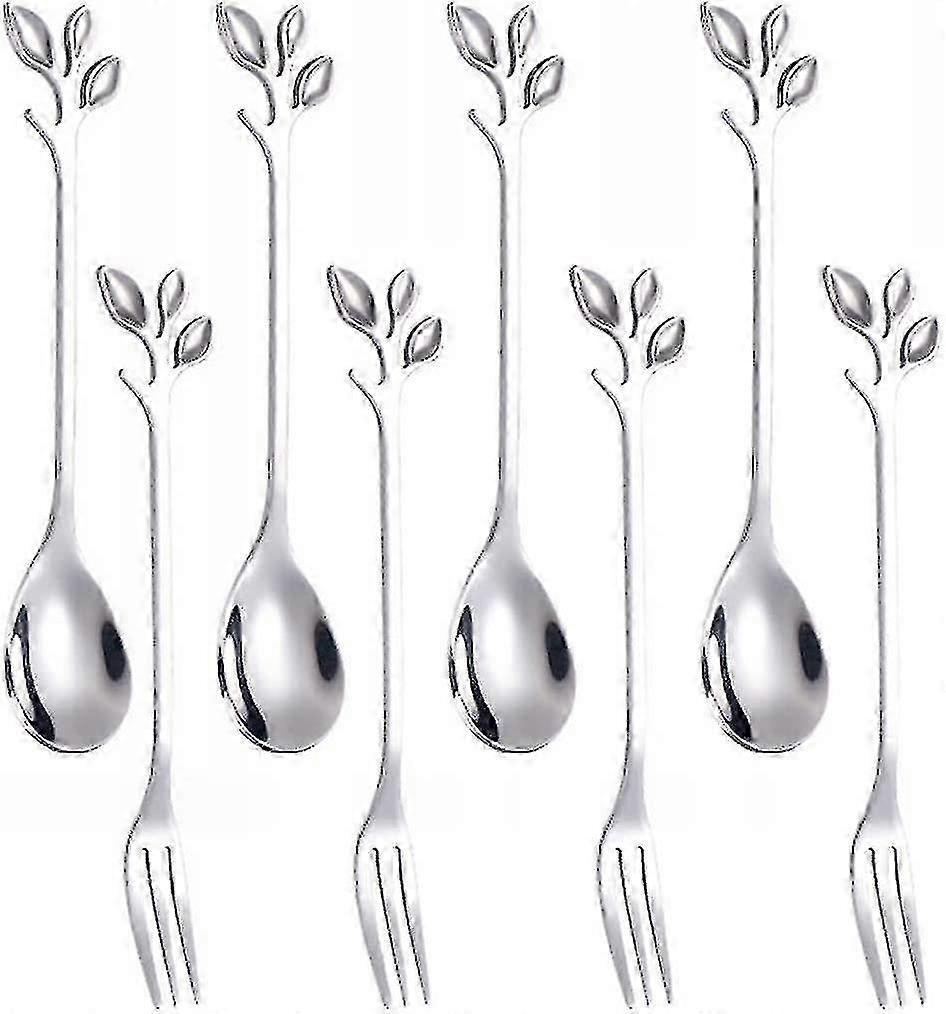 4.7" Small Leaf Handle Coffee Spoons & Forks Set (Silver, 8-Piece)