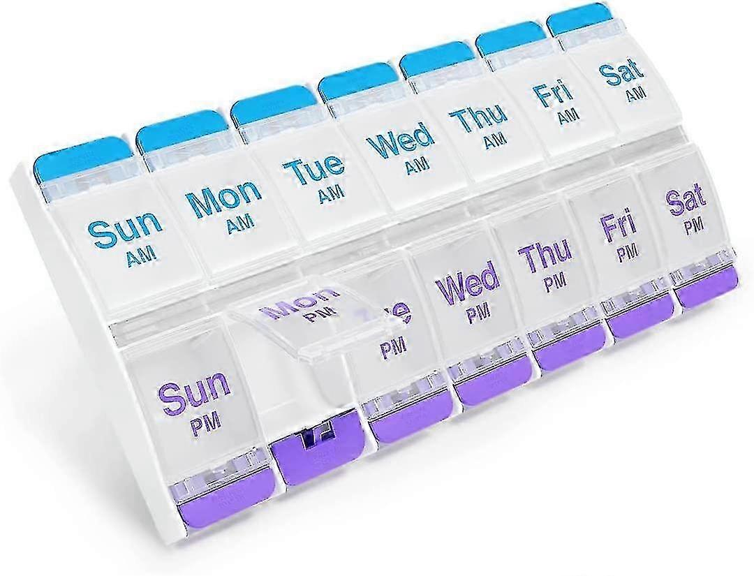 7-day pill organizer with large compartments, clear lids, arthritis-friendly design, am/pm slots for vitamins and medicine