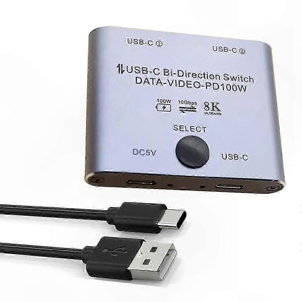 8K USB C Switch USB C Switcher for 2 Computers Bi Directional USB C KVM Switch Features: Bi-Directional USB-C Switch: This USB C switch selector allows 2 USB-C video sources to share 1 monitor or 1 video source to share 2 monitors. Standard USB-C USB3.1 Gen2 cables (NOT included) are required, and a USB cable is needed to power the switch. 8K Ultra HD USB C Switcher: Supports 8K@60Hz video output to USB-C or HDMI monitors, including ultra-wide screen resolutions such as 3440x1440. Backward compatible with 4K@120Hz and 1080P@165Hz. Maximum resolution and refresh rate depend on the source device, monitor, dock, and cables used. PD100W Reverse Charging: Enables fast charging of Type-C phones, laptops, and other devices up to 100W while in use. Note: The monitor, cable, and connected device must support fast charging. 10Gbps Data Transfer: Supports USB3.1 Gen2 data transfer speeds up to 10Gbps, enabling fast transfer of files such as music, movies, and TV shows. Switching between sources is done at the touch of a button. Note: This product does not support Apple display devices from before 2017–2020 that use Thunderbolt 2 or Thunderbolt 3 interfaces. It supports Apple Thunderbolt 4 interface monitors only. Apple monitor users should confirm their monitor model and year before purchase. Ensure your computer or device has at least one USB Type-C port that supports Data, Video, and Power Delivery (PD) before purchasing this 8K USB C switch. Use standard Thunderbolt 3/4 USB-C cables for best results. If connection issues occur, try swapping the ends of the cables, as some monitor and laptop ports have directional wiring and are not fully reversible. Specification: Color: Silver Connector Type: USB Type-C Compatible Devices: Monitor, Personal Computer, Printer Cable Type: USB Package Includes: 1 x Switcher 1 x Power cord 1 x Instruction manual
