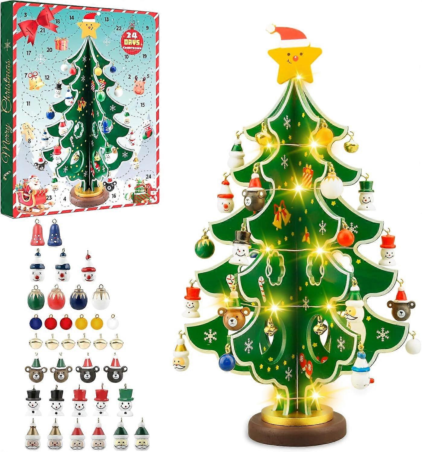 Advent Calendar 2025, 24 Days Countdown Advent Calendar Wooden Xmas Tree with Lights and 28 Mini Ornaments for Xmas Tabletop Decor Party Favors Gift