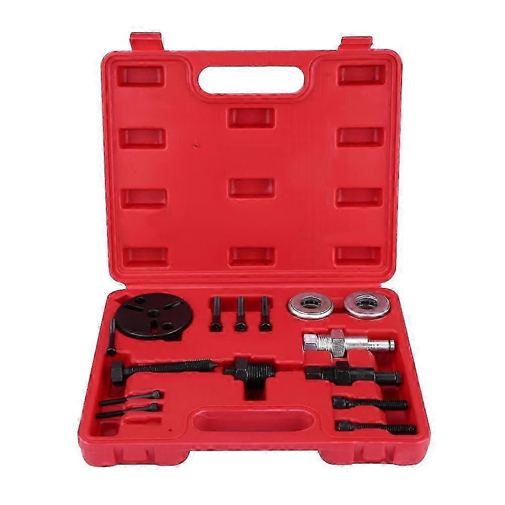 Features:Replaces clutches for FS6, C171, 6P, and 148 compressors.For GM R4 and A6, HR -6, DA -6 and V5 A or C compressors, Sanyo compressors SD505, 507, 510, 708, and 709.2 and 3 hole puller plate fits most clutches.Mechanical force does the pulling, labor saving.Comes with a plastic carry case for easy storage.Specifications:Condition: 100 percent Brand NewMaterial: IronItem Color: Black and SilverPlastic Case Color: RedItem Quantity: 15PcsSize: as picture showPackage Weight: approx.1498gPackage List:1 x Air Conditioning Compressor Clutch Remover Kit