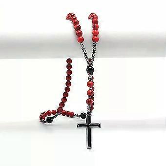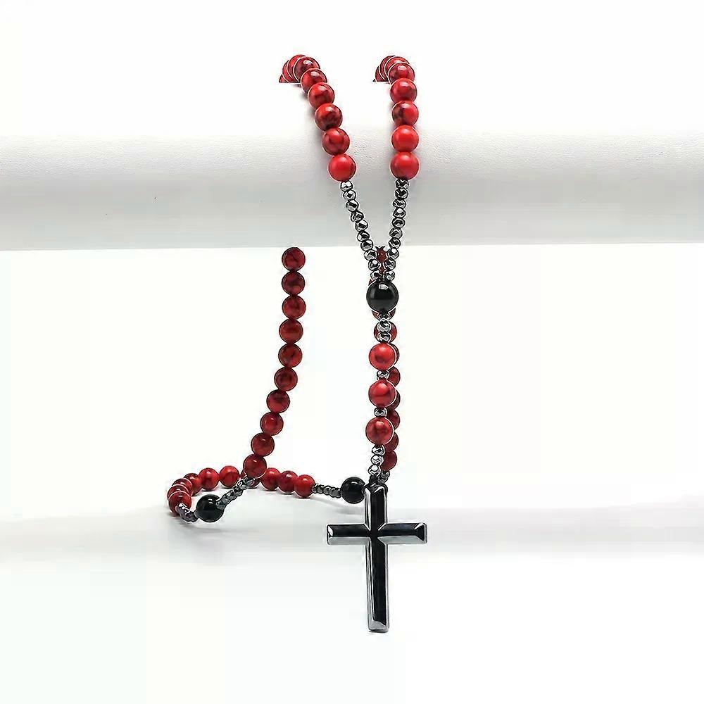 Cross-border Export Natural Stone 8mm Red Pine Stone Black Agate Black Gallstone Cross Rosary For Men Long Chain