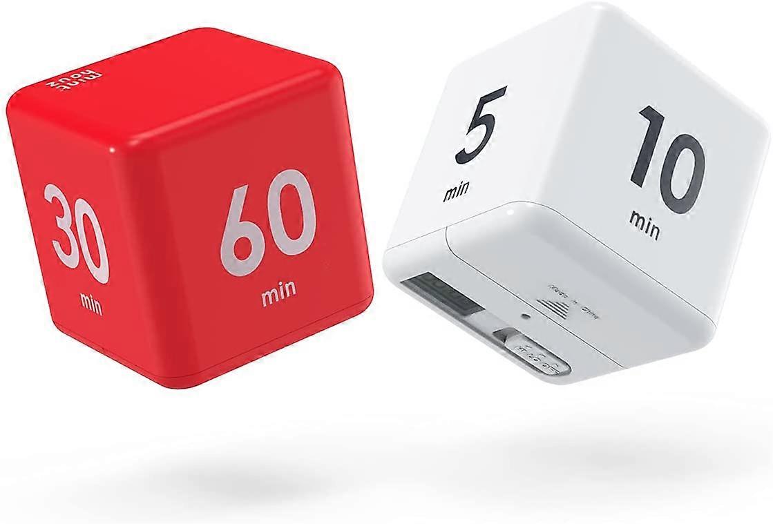 Product InformationThe cube timer has one switch to control the volume (high and low), you can choose different volumes according to different occasions. The timer has a display screen, you can check the remaining time at any time. It requires 2 AAA batteries (not included), which can support the cube timer to work for 6 - 8 months and there will be a gentle flashing red light when it is working. Also, its small size and rounded-corner design are easy to hold. 8 Different SettingsYou will receive 2 pieces cube kitchen timers in different colors, including 1 piece gravity sensor flip timer of 1, 3, 5, 10 minutes (white), and 1 pieces gravity sensor flip timer of 15, 20, 30, 60 minutes (red), 8 settings are sufficient for you to use or replace in daily life. Simple OperationOur cubic digital timer is easy to use. Just turn the switch, place the desired time face up to start the timer, you will hear a beep and the non-glaring red light will flash. When the time is up, the alarm will beep again, just turn the blank face up to end timing. Suitable for Multiple ScenariosThe practical cube timer is a nice time management tool for home cooking, children's study, company office, game, physical exercise and other activities. It is a best gift for your family and friends. Timer Cube AdvantagesIt's a gravity sensor timer, no need to control mechanically. Compared to an original timer, it has two volume adjustments and is easy to use without cumbersome operation.