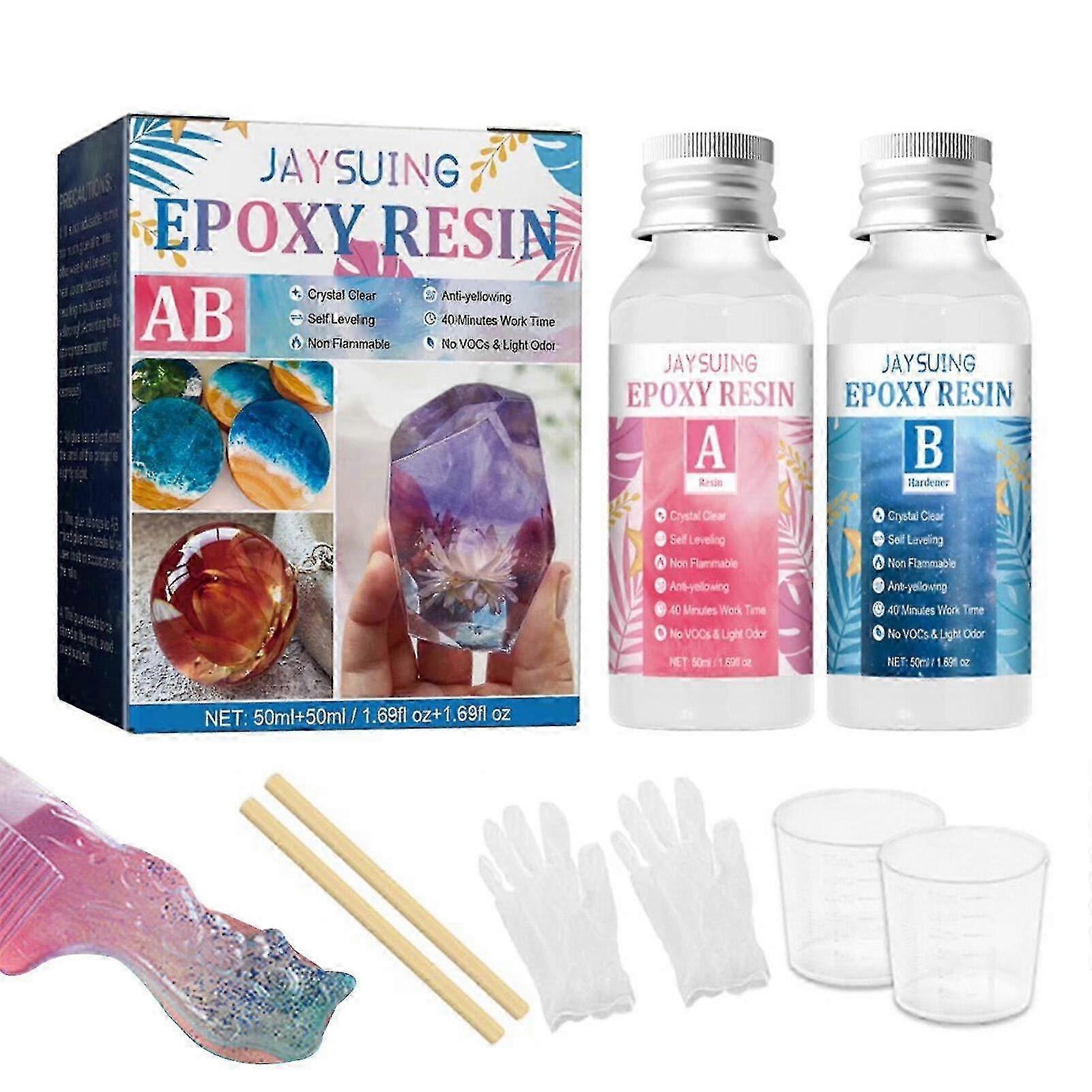 Epoxy Resin Kit for Beginners Epoxy Resin Jewellery Making Kit 50mland50ml Description: Our Resin Kits are made of high-quality epoxy and hardener materials that are safe for everyday use. It is ideal for resin art, decoration, jewelry making, crystal clear coating, casting, and more. Specification: Name: Resin Kits Capacity: Epoxy resin: 50ml Hardener: 50ml Size about: Epoxy resin: 9.2x3.4cm or 3.62x1.34in Hardener: 9.2x3.4cm or 3.62x1.34in Stirring stick: 11.2x1cm or 4.41x0.39in Scale cup: 3.8x3.7cm or 1.5x1.46in Gloves: 26.5x24cm or 10.43x9.45in Packing List: 1xEpoxy resin 1xHardener 2xstirring sticks 2xscale cup 2xGloves Note: Due to different lighting and screen settings, item colors may vary slightly from the pictures. Due to the difference in manual measurement, please allow 1-2cm difference in size. Note: Due to the light and screen setting difference, the item's color may be slightly different from the pictures. Please allow slight dimension difference due to different manual measurement.