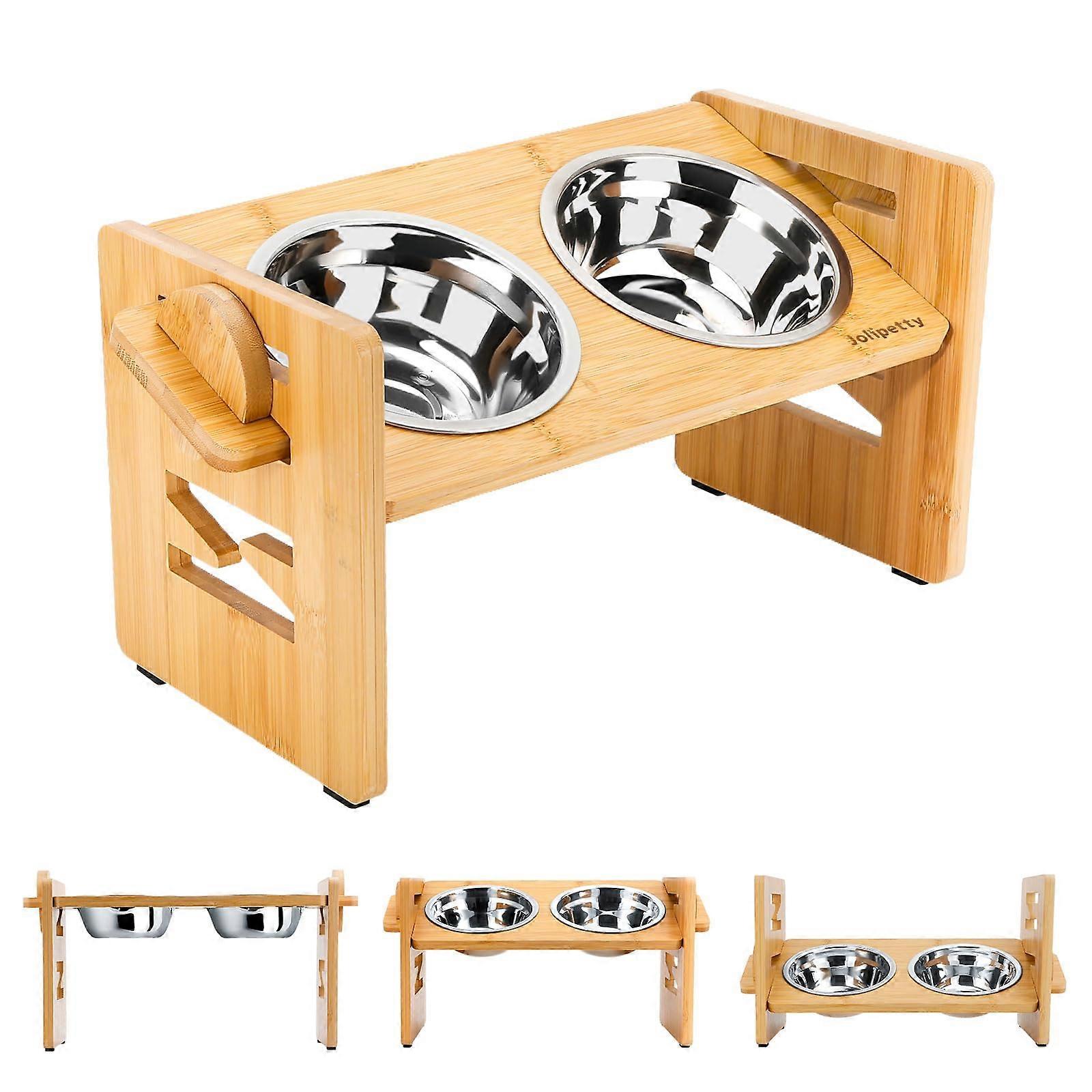 Elevated Cat Bowls and Dog Bowls for Small Pets, Bamboo Raised Stand with 2 Stainless Steel Bowls, 15° Tilted Design