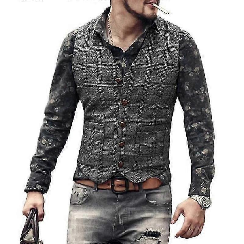 Mens Plaid Tweed Waistcoats V-Neck Wool Herringbone Vests