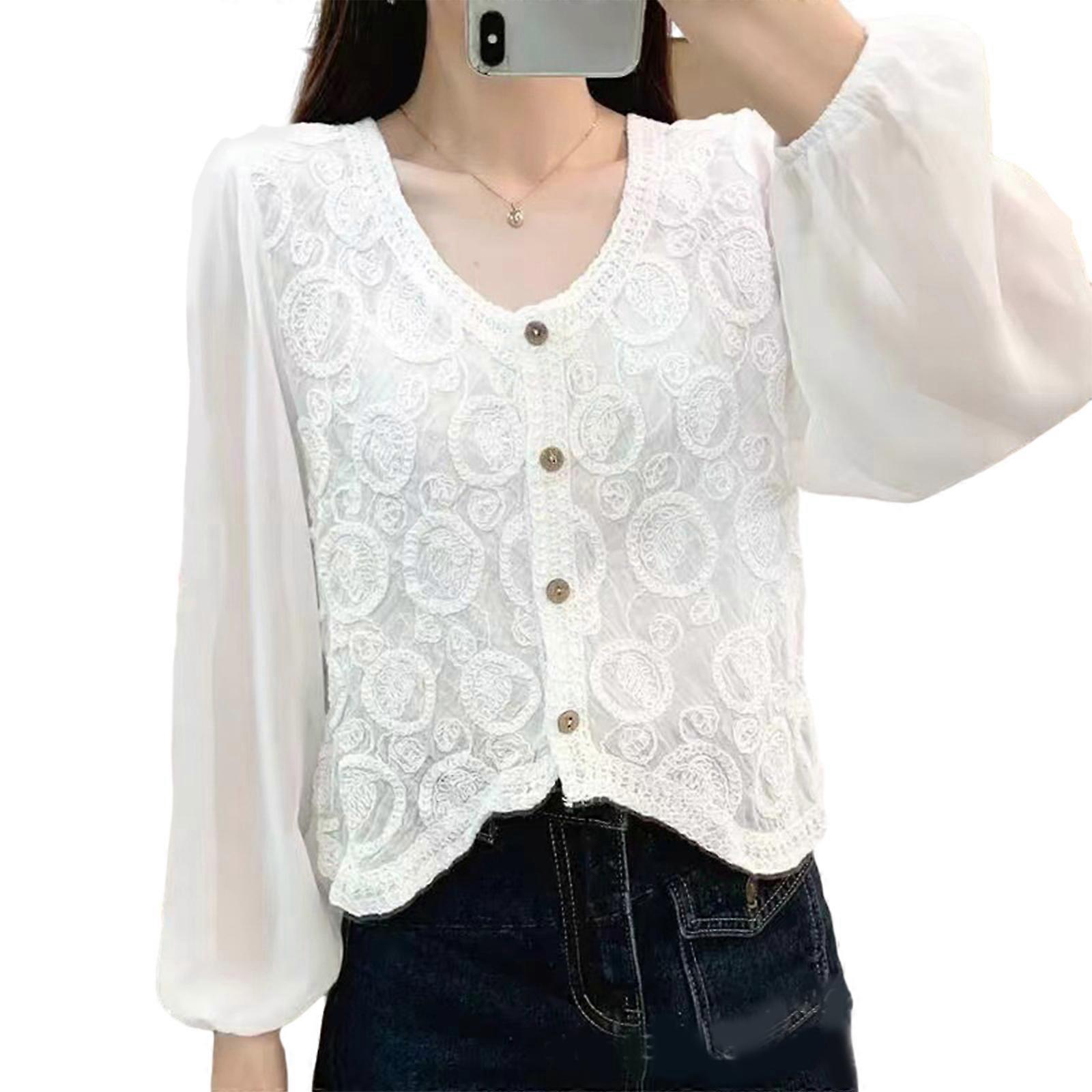 Exquisite Hollow Out V neck Lace Chiffon Top Long Sleeve Shirts Add a touch of Elegance to Your Wardrobe White