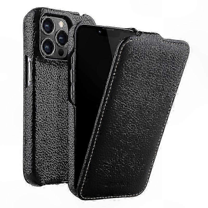 Genuine Cowhide Leather and PC Vertical Flip Case with Litchi Texture for 14 Pro Phone Cover
