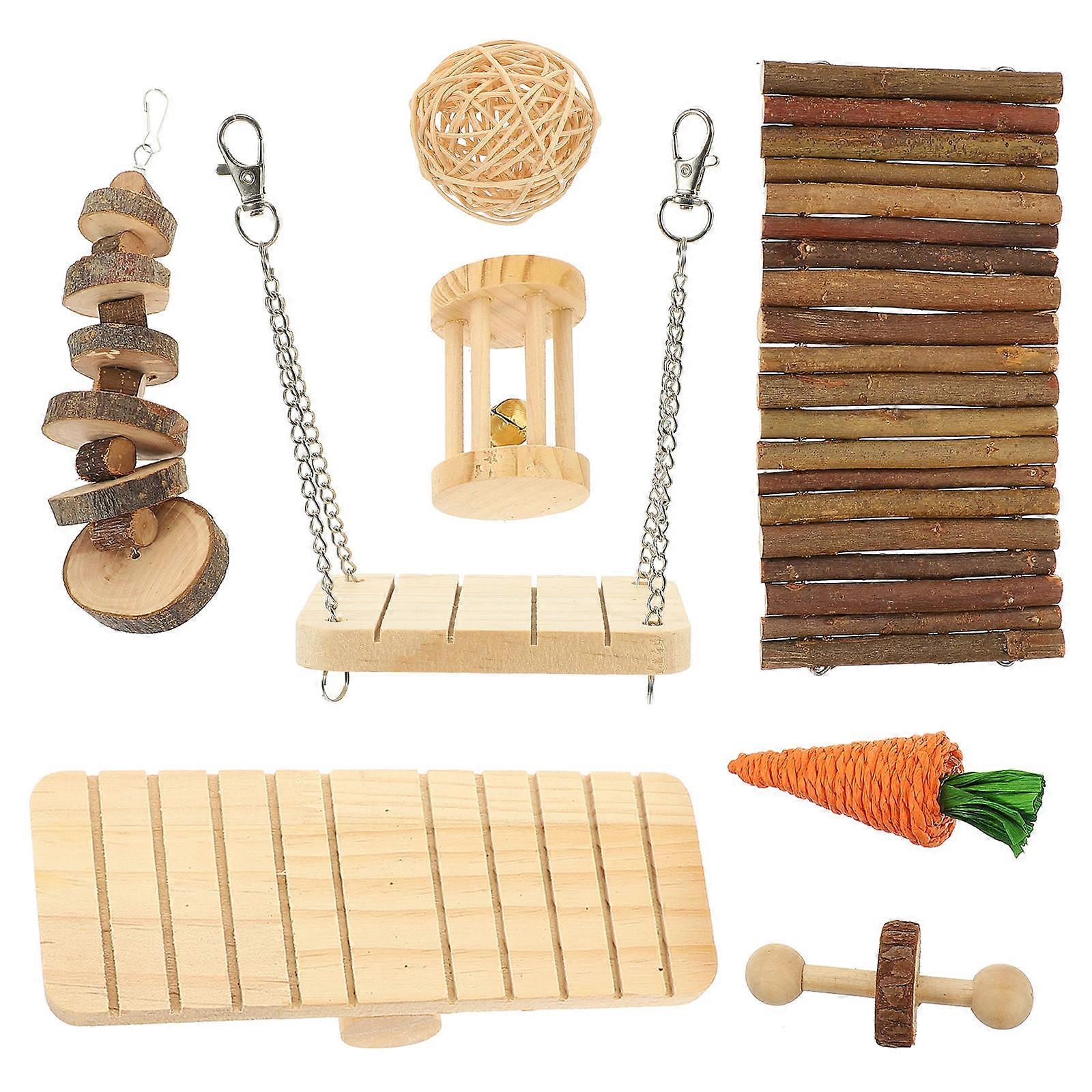 Small pets' teeth grow quickly, need to give your pet some toys that can grind their teeth. This Rabbit Chew Toy is moderately hard and your pet will enjoy pushing, rolling and grinding their teeth with it. Let your pet grind its teeth while eating to avoid your pet biting other things at will. Perfect for your pet to play, grind and chew. Features -Color:As Shown -Material:Wood -Size(Seesaw):19.00X7.00X4.00cm/7.47X2.75X1.57in -Size(Bridge):19.50X10.00X1.00cm/7.66X3.93X0.39in -Size(Ball):6.00X6.00X6.00cm/2.36X2.36X2.36in -Size(Carrot):10.00X3.00X3.00cm/3.93X1.18X1.18in -Size(Swing):9.00X7.00X13.00cm/3.54X2.75X5.11in -Size(Bell):5.00X5.00X7.00cm/1.97X1.97X2.75in -Size(Wood String):5.00X5.00X19.00cm/1.97X1.97X7.47in -Size:9.00X3.50X3.50cm/3.54X1.38X1.38in -Our Hamster Chew Toys are made from natural and premium wood without any or paint. materials are heat-treated and dried at high temperature. Provide more chew toys for your little ones. - not only care for healthy tooth growth, but also add fun to exploring. Very funny. -These small pet toys are good for hamsters, gerbils, , , , , , dwarf hamsters and other small animals. -Hamster Chew Toys are widely used, oral chew toys are suitable for hamsters, squirrels, house rabbits, guinea pigs, etc. Package list: x Hamster Chew Toys
