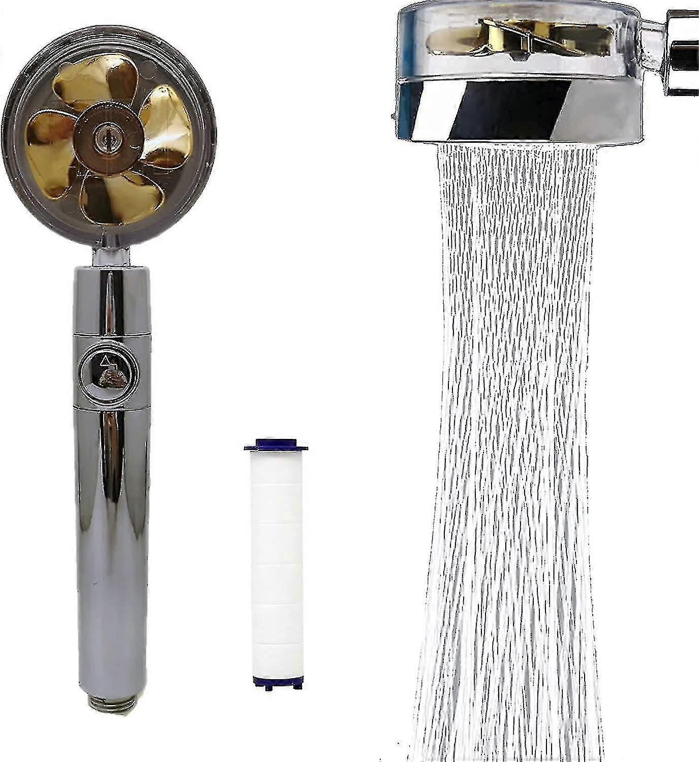 High Quality MaterialsHigh quality ABS material and stainless steel panel, Innovative design, easy to install and clean, environmentally friendly and durable, universal 360-degree rotation.Hand ShowerUnique propeller-driven design, fan turbocharged water flow, helps you clean up residual soap bubbles in seconds.Water Saving ModeThe shower head has an on/off button. Just press the switch on the handle of the nozzle to stop the water flow at any time.Filtration SystemFor water purification, the shower head is equipped with PP cotton. We also give you an extra PP cotton, which can effectively remove most of the impurities in the water and protect the health and safety of the familys skin.Easy Tool-free ConnectionNo need to call a plumber,Easy installation, simply screw onto any standard shower hose . Can connect to any standard shower hose easily.