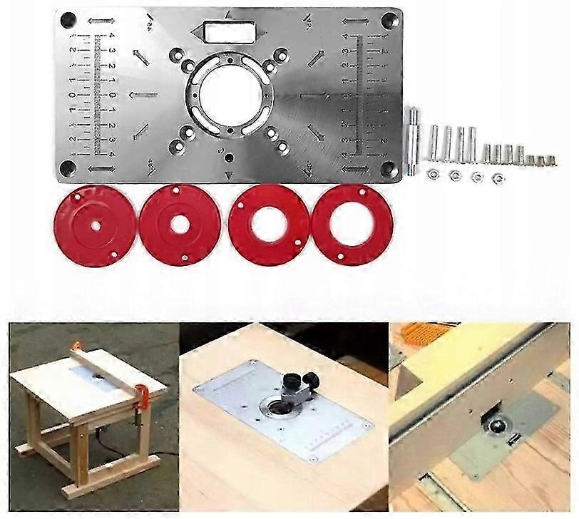 Carpinte Router Table Tile Woodworking Bench Aluminum Milling Machine Plate Tool Wood Milling Machine with 4 Rings Technical data: Material: Aluminum alloy plate, plastic rings Type: with 4 red insert rings, Size: ok. 235x120x8mm or 9.3x4.7 x 0.3in Hole distance: about 62x70mm or 2.44x2, 76in Weight: 450g or 0,99lb Package Weight: 502g or 1.1lb Characteristics: -Ring with ABS insert, fast heating, wear resistance and fall resistance. -Aluminum alloy material, compacted overall, durable. -The scale is clear, the measurement is accurate and convenient to control. -High quality accessories, work more freely. -DIY helper for woodworking at home. -Polished surface, smooth and not rusted. -Easy and convenient to use. Packaging List: 1 x Router Table Tile 4 x Router Insertion Rings 1 x set of fixing screws
