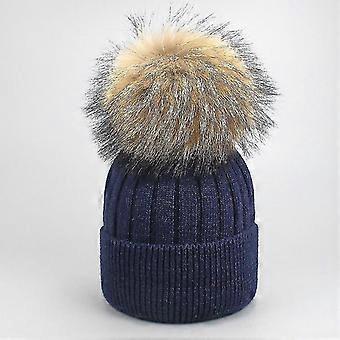 Girl Women Winter Wool Beanie Cap Real Raccoon Fur Pom Pom Parent-child Knitted Hat Core Yarn Warm Casual Skullies Beanies Bones