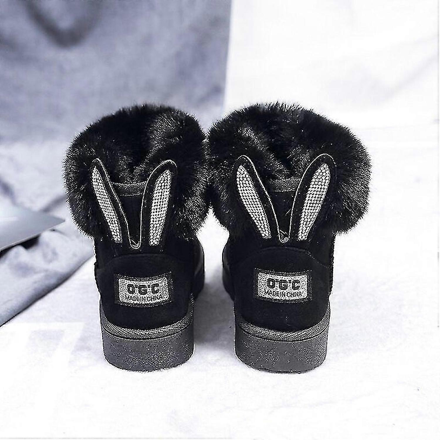 Women Boots Fox Fur Brand Winter Shoes Warm Snow Boots Black Round Toe Casual Female Slip-on Woolen Flats