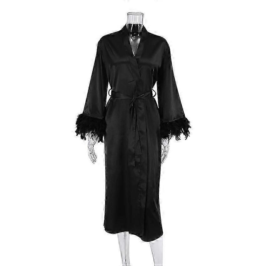 Women's Long Sleeve Satin Fuzzy Trim Robe Bridesmaid Robe Wedding Party Robe