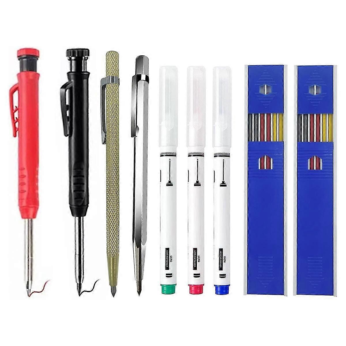 The pencil requires 2.8mm refills, the pencil and pocket holder design easy for to carry and use; the sharpener on top of the deep hole woodworking pencil will help you keep your pencil always useful. The metal marker pen uses a tungsten carbide tip that can mark on hard materials such as hardened steel, stainless steel, ceramics and glass, a necessary machining tool that can provide . You can use this practical pen and woodworking pencil to write on metal, stainless steel, glass, ceramics, marble, wood, etc. They can be easily marked on surfaces and can also be used to mark your keys, metal items, etc., suitable for , builders and painters. Different color refills are provided to choose when marking; a good gift for fathers, friends and DIY enthusiasts to express your sincere wishes and happiness. The set includes 2 carpenter pencils, built-in sharpener and 12 refills, 3 long nose deep hole markers and 2 tungsten carbide scribers, this set can satisfy you where you want it Labeling and long-term use requirements. Colour:As Shown Material:Metal Package Contents: 1set * construction marker Tools Only the above package content, other products are not included. Note: Light reflection and different displays may cause the color of the item in the picture a little different from the real thing. The measurement allowed error is +/- 1-3cm.