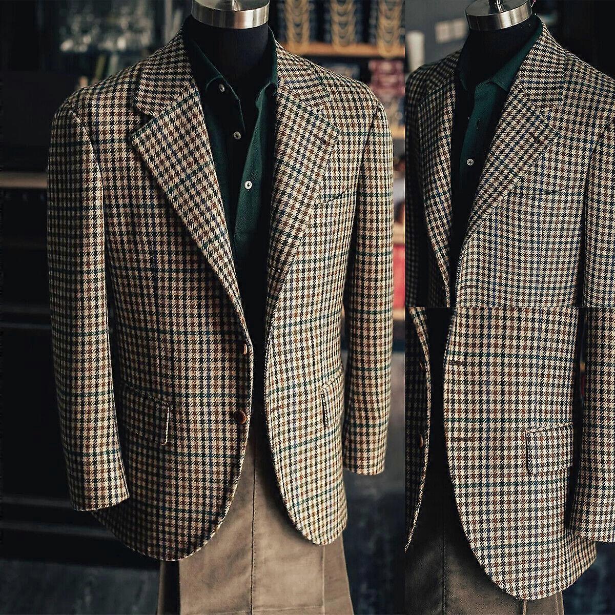 Men's Houndstooth Jacket Wide Notched Lapel Blazer with Solid Pant for Business