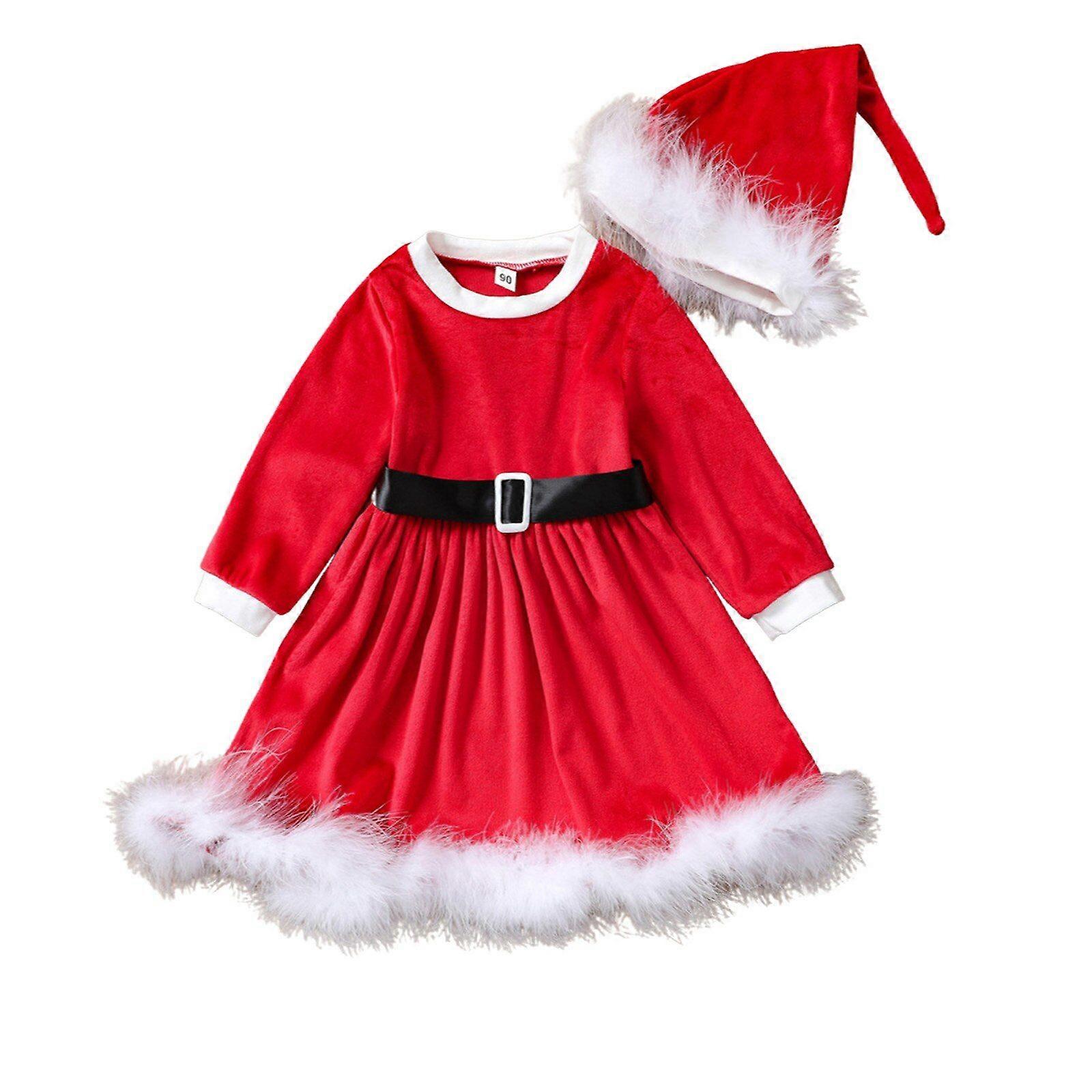 Christmas Girl Dress 2Pc Set Long Sleeve Party Dress And Hat Belt Decoration Plush Fluffy Clothing Xmas Santa Clothes Dress