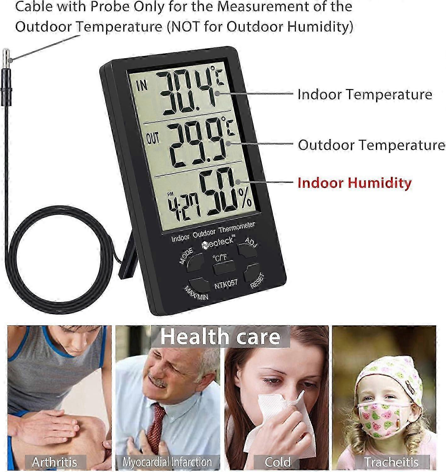 Outdoor Temperature Humidity Meter with Alarm Function and 1.5M Sensor Wire for Hotel Hospital Room - Black