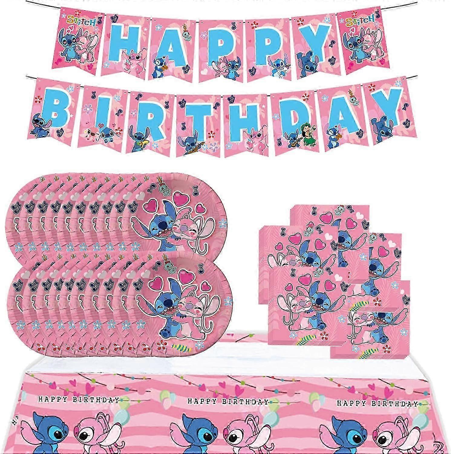 Pink Stitch Party Birthday Supplies, Cartoon Stitch Theme Party Tableware with Happy Birthday Banner, Tablecloth, 20 Disposable 7" Paper Plates