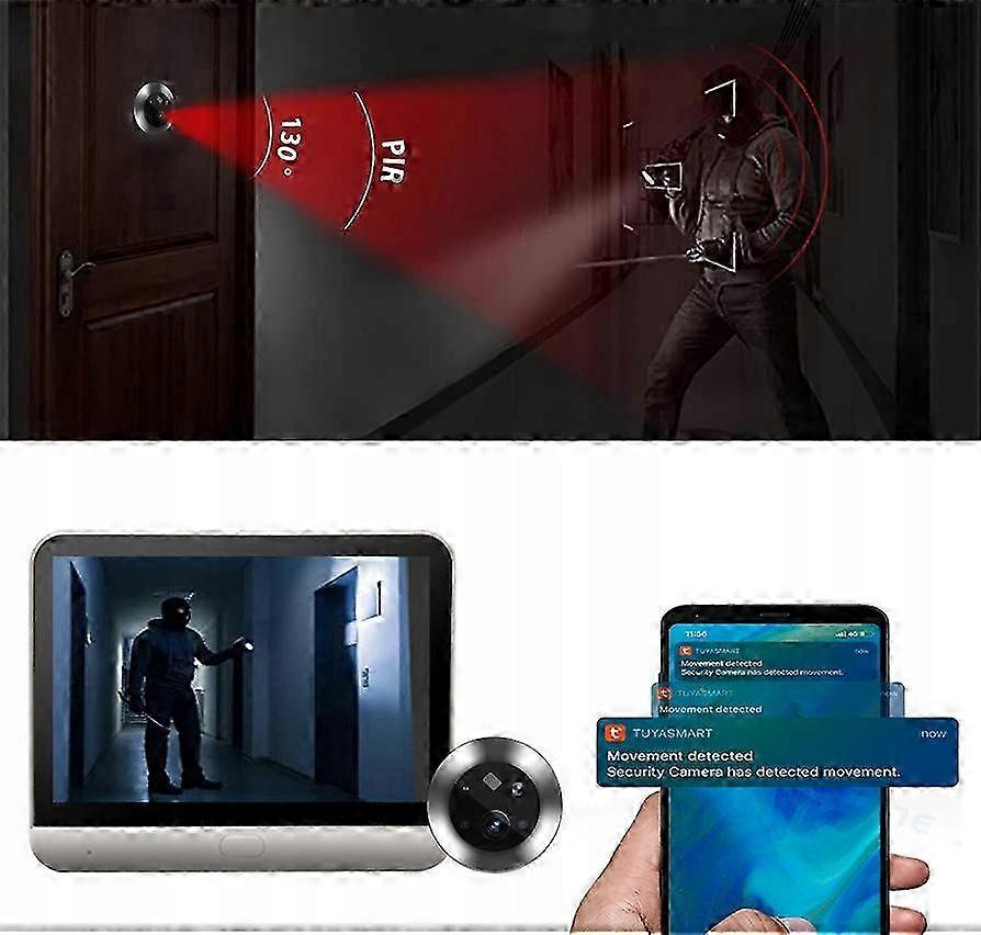 It can connect to your wi-fi router wirelessly. You can monitor (handheld, including smartphones, android tablets) and one- or two-way intercom with noise reduction (visitors viewing, video calls, snapshots, recordings, etc. ). The system function menu is located in the console of the mobile application instead of the exhibition inside the building. ). At the same time, the large 4.3" LCD screen allows you or your family to see the door clearly and sharply. (Pir detection and wide angle 100° ) Using 1080P 100° wide angle lens camera, automatic switching of day/night vision sensitivity (adjustable; Distance is about 3-4 meters), LCD TFT color display, suitable for AHD images and videos. Easily maximize home security with a clear view of the door. (One-way intercom provides convenience) When someone at the doorbell triggers the pir and the app receives notifications and you can check the live preview, see who is at the door and hear what the guest is saying. But the guy can't hear what you're saying. Because the door camera is so mini that you cannot install the speaker. (Long-term control durable battery and applications ) The built-in high-capacity 5000 mAh battery supports 30 days long standby time (usually 3-5 calls per day), low battery reminder and USB port charging. This digital viewfinder supports both iOS and Android, download the Smart Life app to get every detail of what’s happening every day in your front door anytime, anywhere. Never miss a visitor or prevent theft, strangers or voyeurs. (Tf card or cloud storage ) Supports max. 128G TF( card Does not include) for local recording or event. Package Contents: - Door camera monitor - USB cable charging - no need to remove the monitor to charge the battery - Back plate - Screws - User manual