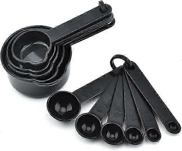 Engraved Measuring Markings each black measuring cups and spoons has the accurate measurements size in both engraved on the front handle clearly,what will help you reduce any measuring errors for cooking or baking! Different sizes - The black measuring cups and spoons set have 5 sized cups and 6 sized spoons to ensure that you have the right measurement for any recipe. Cup sizes are: 1 cup - 8oz (250ml),1/2 cup - 4oz (125ml),1/3 cup -2-3/2oz (80ml),1/4 cup - 2oz (60ml), 1/8 cup - 1oz (30ml),6 Measuring Spoons: 1 tbsp (15ml),1/2 tbsp (7.5ml),1 tsp (5 ml), 1/2 tsp (2.5 ml),1/4 tsp (1.25 ml),1/8 tsp 0.63 ml) Quality Plastic Measuring Cups and Spoons Set These 5 measuring cups and 6 measuring spoons are made from food grade materials and BPA ,can be placed in the dishwasher ly . Great Present for your Friends - the Plastic Measuring Cups and Spoons have round shaped heads that are perfect for measuring different ingredients. The black Measuring Cups and Spoon Set makes them an excellent gift for the people you love.