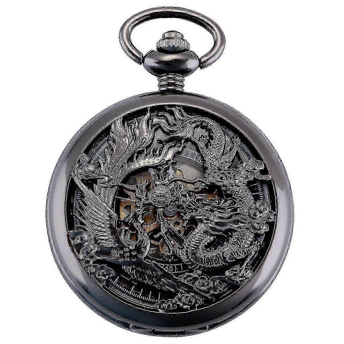 Retro Men's Pocket Watch With Chain Analogue Manual Winding Dragon Phoenix Skeleton Roman