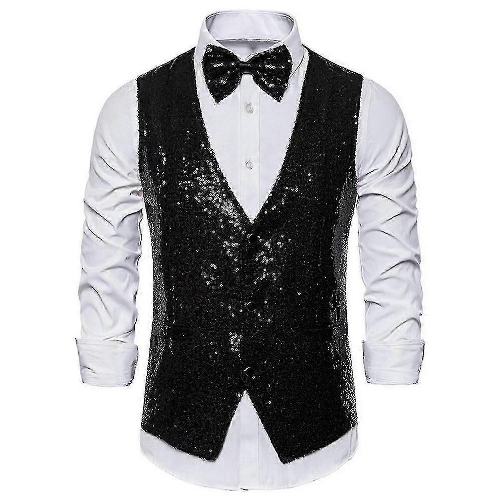 Shiny Sequin Men Vest Bow Set Sleeveless Slim Fit Single Breasted V Neck Stage Performance Waistcoat