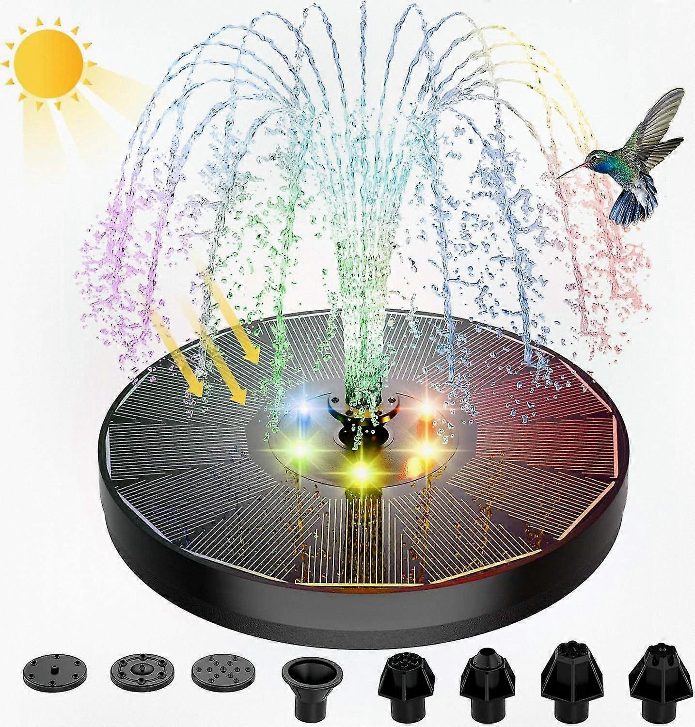 Solar-Powered Bird Bath Fountain with Colorful LED Lights, 4W Pump, 7 Nozzles, and 4 Fixers for Small Gardens and Outdoor Spaces