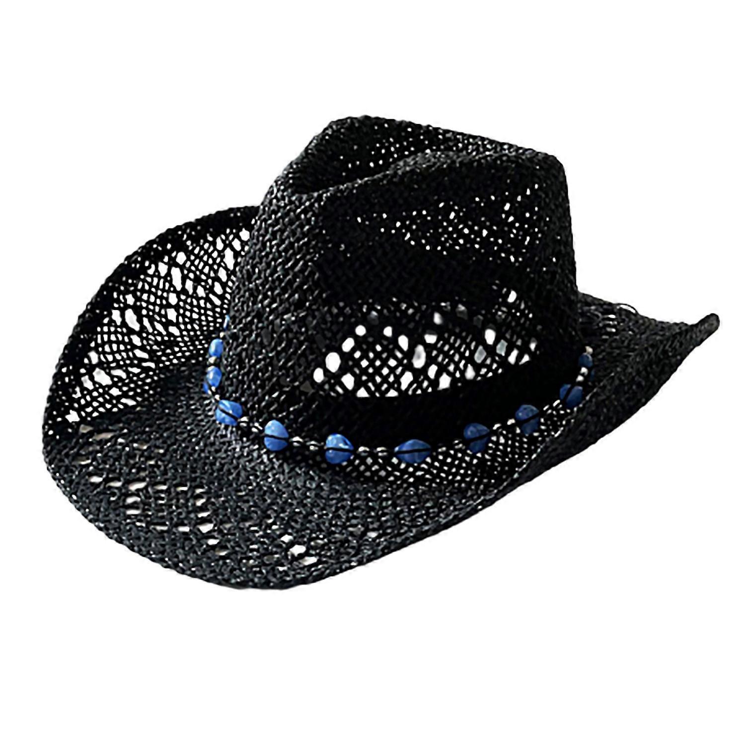 Summer Straw Hat Hollow Out Foldable Adjustable Bead Decor Curled Edge Windproof Strap Western