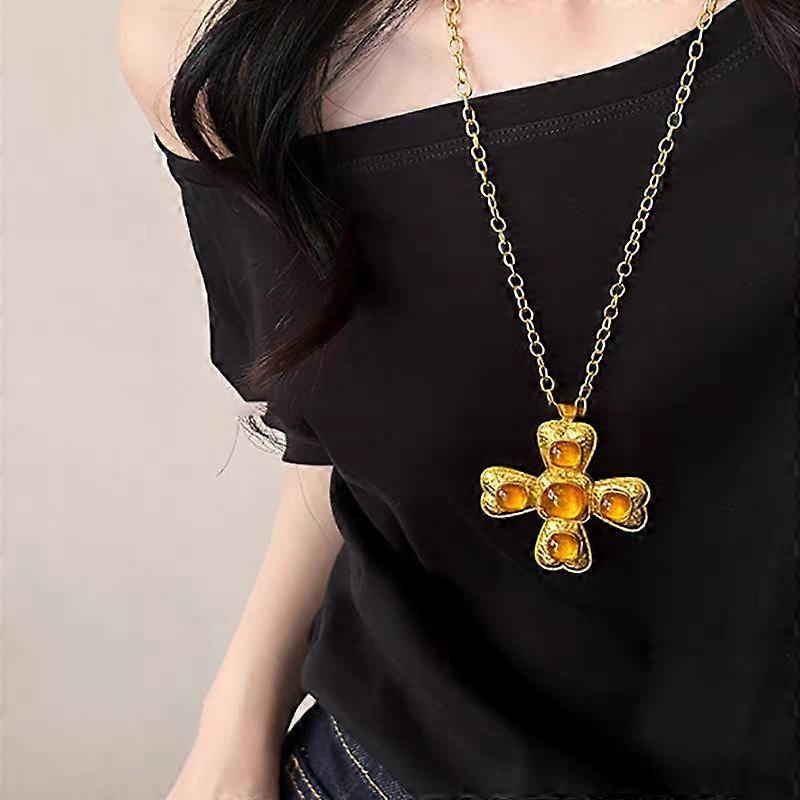 Trend Retro Fashion Transparent Yellow Resin Stone Metal Cross Pendant Necklace For Women Men Couple Neck Chain