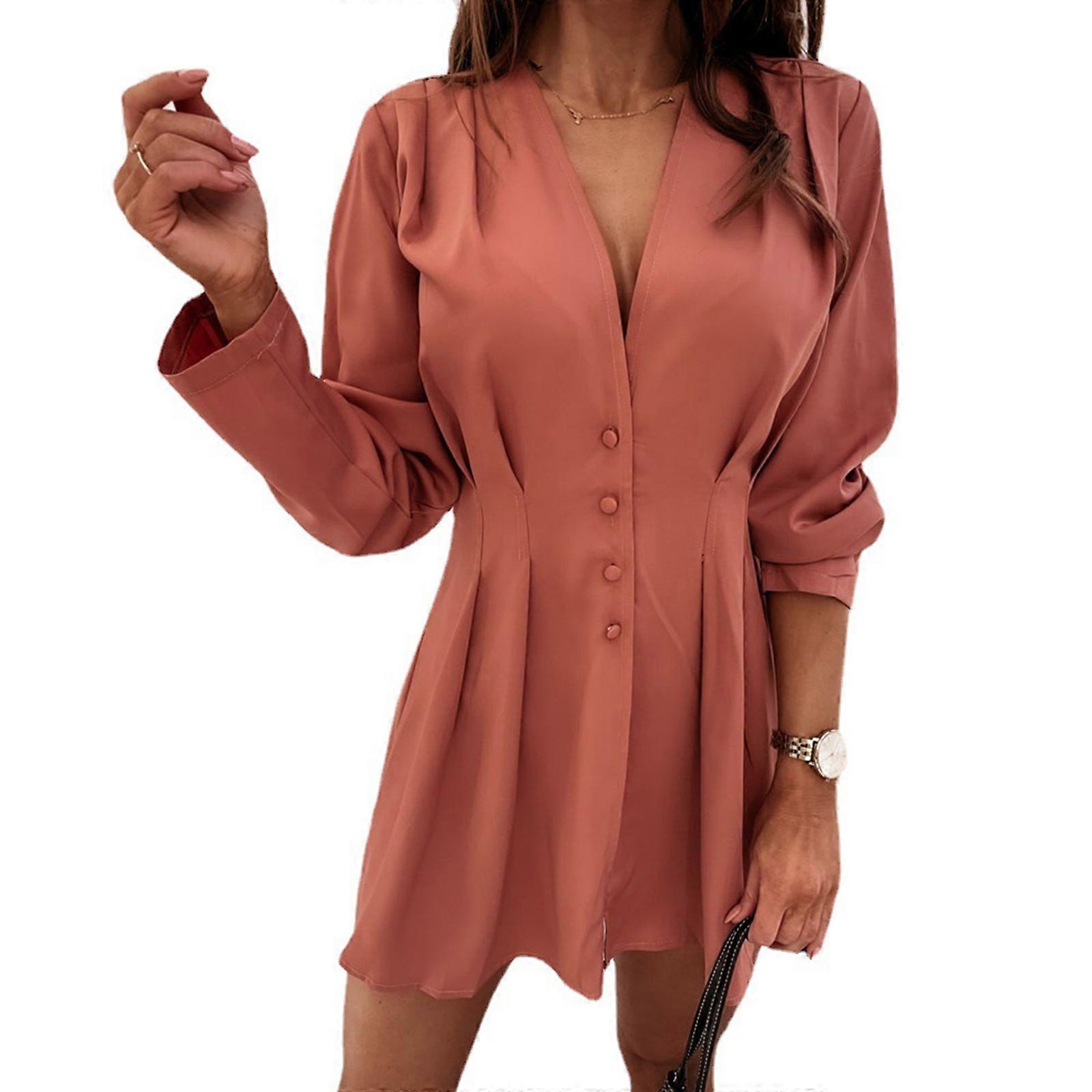 Trendy V Neck Buttoned Long Sleeve Dress Solid Color Casual A-line Dresses Great for Work School orange XS