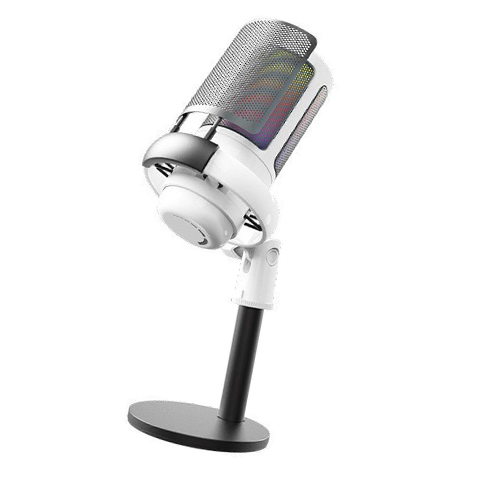 USB Microphone for PC Gaming with Color Lighting Condenser with Mic Mute Button Knob Monitoring Solid Base Adjustable White