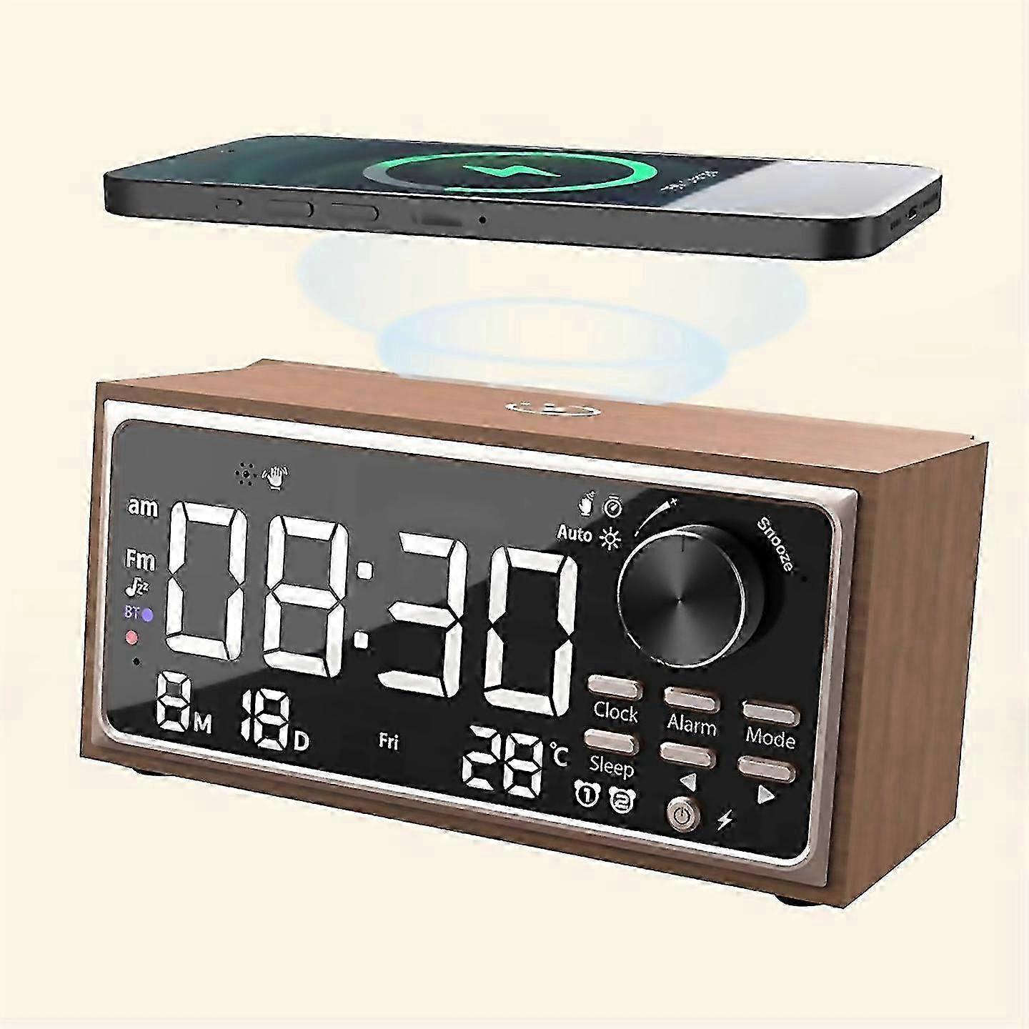Vintage Dual Alarm Clock Radio With Wireless Charging Fm Radio Led Display Dimmer Control For Bed