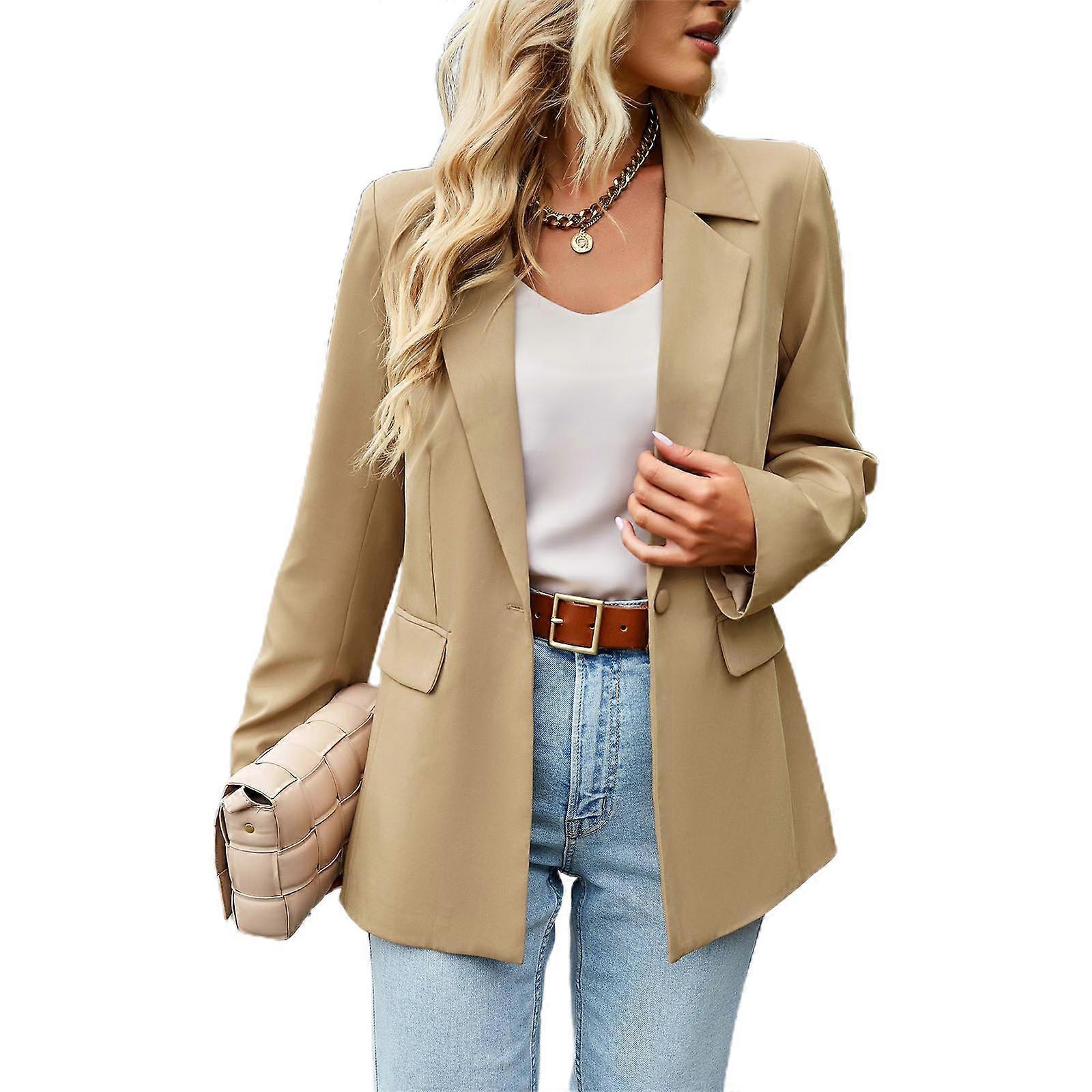 Women's Casual Suits Loose Fit Button Open Front Suit Jackets Lapel Long Sleeve Suit with Pockets Work Office Jackets Khaki XL