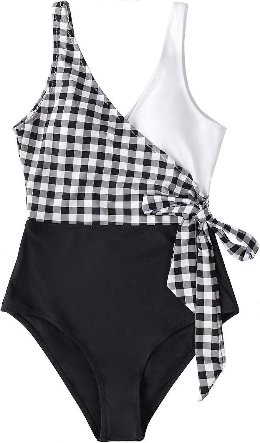 Women's One Piece Swimsuit Wrap Color Block Tie Side Bathing Suit(Black White Grid L)