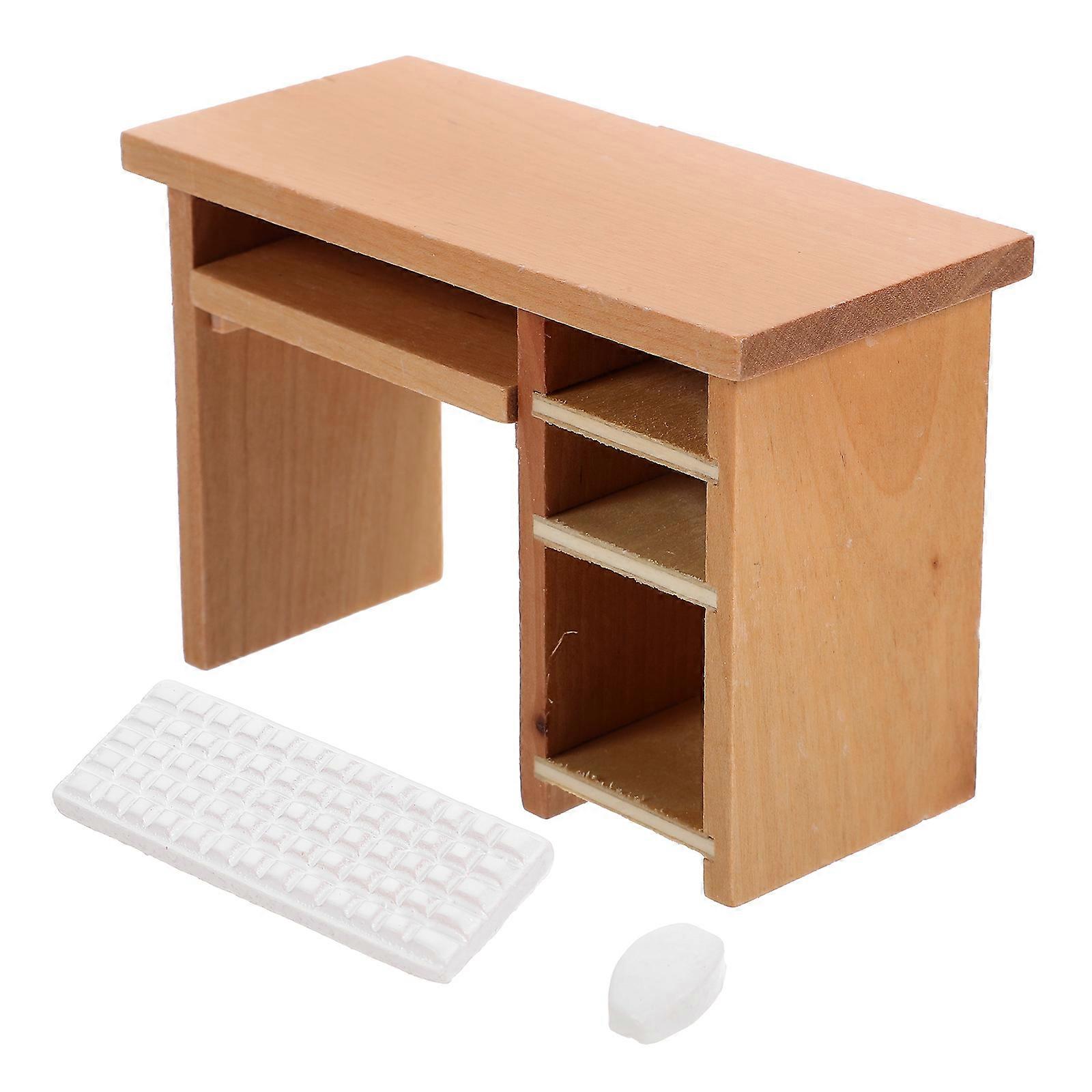 Wooden Miniature Office Table with Mouse and Keyboard for Decor Khaki Color 1 Set